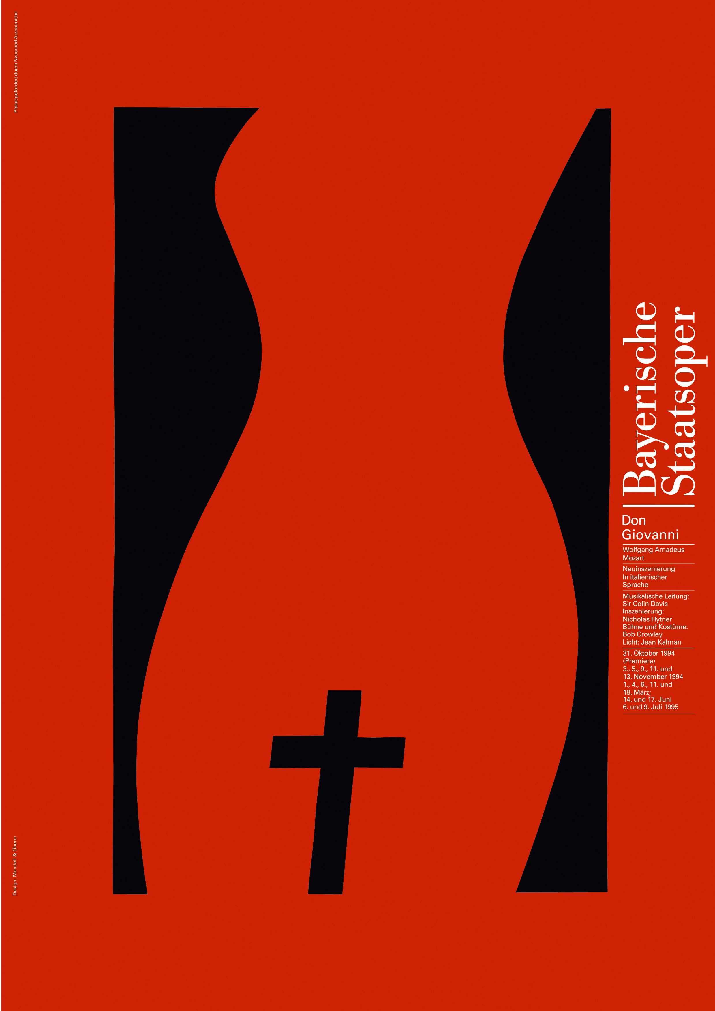 Das Plakat der Bayerischen Staatsoper zur Produktion von Don Giovanni aus der Spielzeit 1994/95 ist ein Geniestreich, der es in sich hat – nach wie vor. Vielleicht hätte man eher, sozusagen spontan-assoziativ, auf Lucia di Lammermoor oder Les Huguenots getippt. Doch Don Giovanni ist die perfekte Wahl: Im Spektrum von Verlangen, Körperlichkeit und Sexualität einerseits und empfundenen wie verloren gegangenen Überzeugungen und Glaubensgrundsätzen andererseits sind sämtliche Akteure gefangen. Singspiel und Sittengemälde, heitere Oper und Mysteriendrama – alles auf einem einzigen, knappen Plakat. Chapeau!