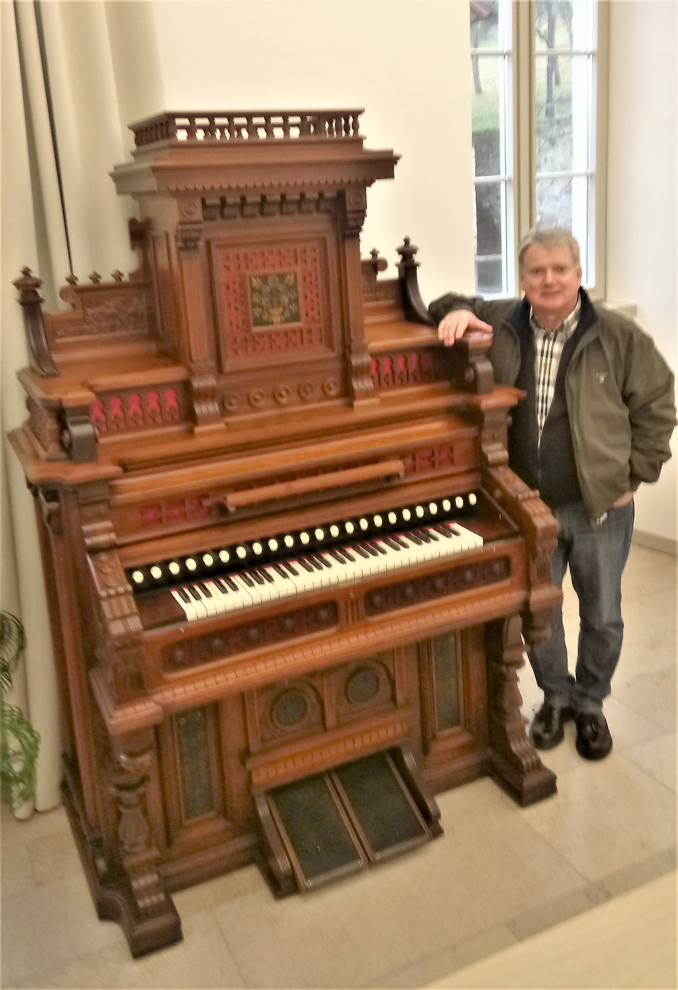 Die Bayerische Musikakademie Hammelburg, in der ich gestern zu Gast war, verfügt in ihren beeindruckenden Räumlichkeiten u. a. über ein Harmonium des Herstellers Estey Organ Company aus dem Jahr 1888. Das imposante Instrument hat die Bezeichnung Grand Salon Style 910. Von diesem Typ sind weltweit nur ca. 20 Instrumente vorhanden, dabei nur fünf vom Style 910 mit 23 (!) Registern. Allen Instrumenten vom Typ Grand Salon ist ein typischer Aufsatz zu eigen, der beim Instrument der Musikakademie fehlte. Die zunächst verwendete einfache Abdeckplatte wurde durch die Rekonstruktion des originalen Gehäuseaufsatzes aus Kirschbaumholz ersetzt. Das Instrument ist voll funktionstüchtig und hat – zumal in der Bässen – einen voluminösen Klang. Das Harmonium kann sowohl vom Spieler selbst über die Pumptritte oder von einem Kalkanten (Bälgetreter) mittels der rekonstruierten Schöpfbälge am Pumpgriff mit Wind versorgt werden.